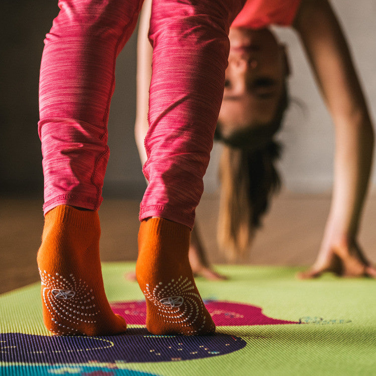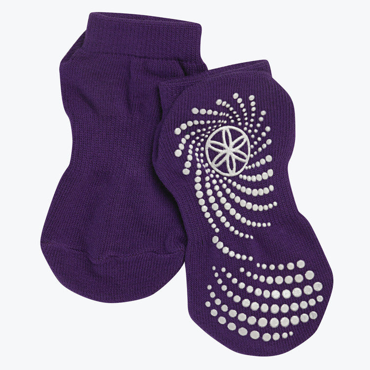 No-slip and no-slide. Sticky design turns little feet into grippy feet, so your little yogis will stay in place on or off the mat. 2-pack with full-toe coverage. Kids shoe sizes 11-4.