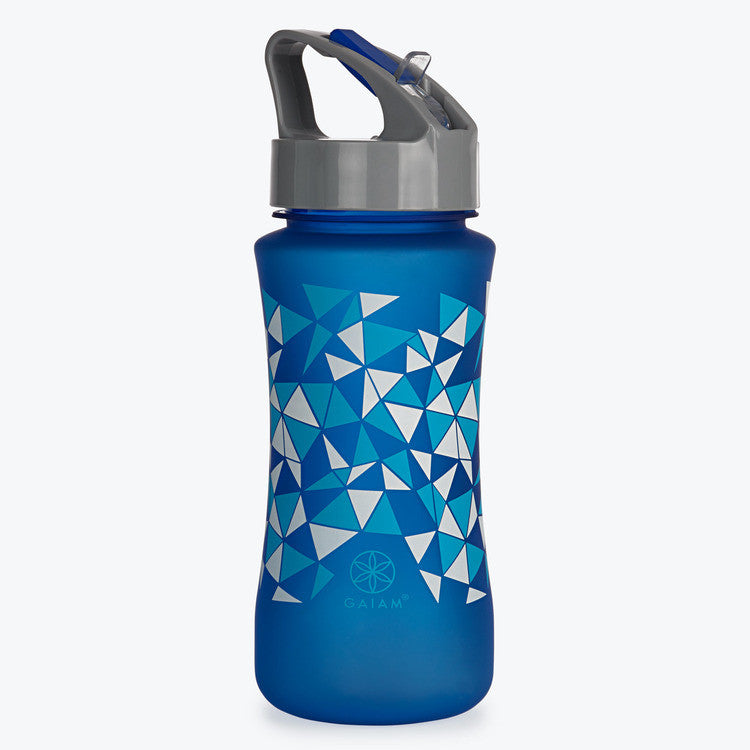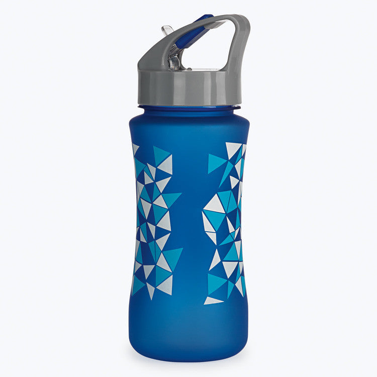 Stay hydrated with this easy to drink from, spill resistant blue geo water bottle. The 18oz. BPA-free plastic water bottle features a flip-straw closure, wide-mouth screw top and leak-proof design. Dishwasher safe.