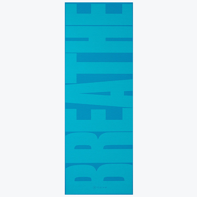 Take an extra breath with our Premium Gaiam "Breathe" Yoga mat. Whether your extending your Downward Facing Dog or lengthening your Eagle Pose, this mat will remind you to breathe deeply and move mindfully. The 5mm of thickness provides extra cushioning to help protect your joints and it is manufactured free of the top six most harmful phthalates.