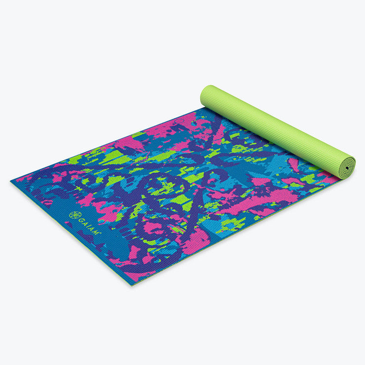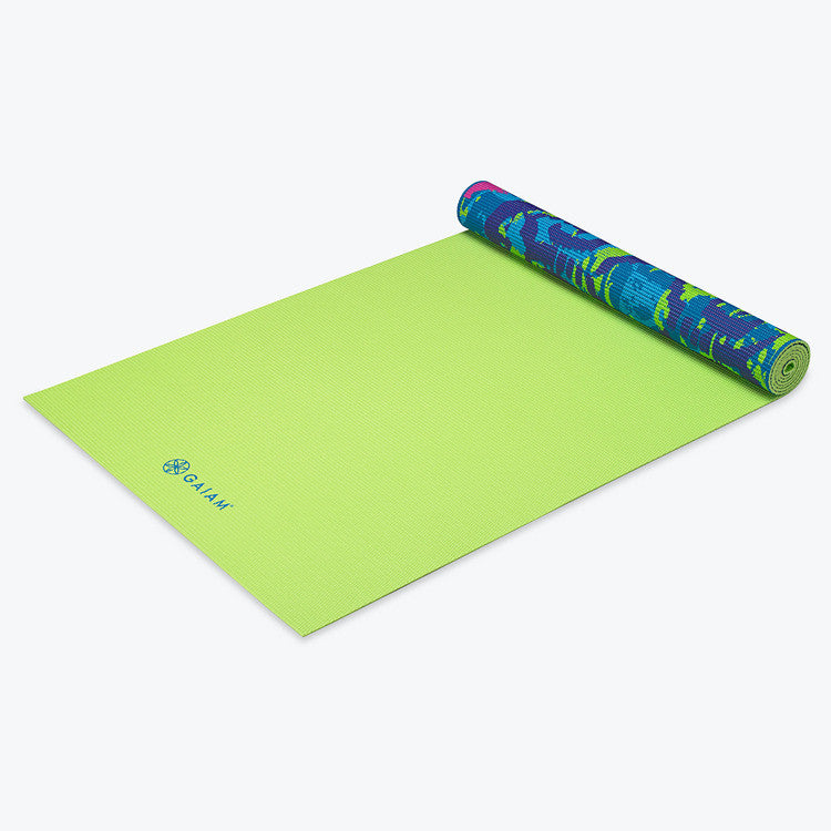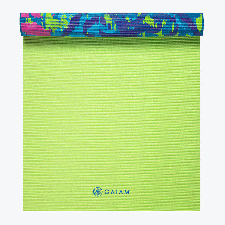 Mix it up during each use with your choice between a vibrant print or a bright neon lime on this two sided yoga mat. With 3mm of thickness, you and your joints will be cushioned during any inversion or down dog. The texture of this mat is made from no slip, grippy material, keeping you in place during any pose. Made without the six most harmful phthalates and latex free. This mat is also a Gaiam.com exclusive and coordinates perfectly with our Two Fit Moms Marrakesh Infusion Collection.